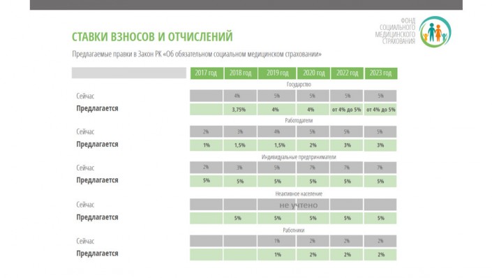 Отчисления работодателя в условиях 2018 года, когда будет ставка 1,5 процента, составят - 27 379 тенге в год. Индивидуальные предприниматели за тот же период примерно будут отчислять 33 941 тенге. А взносы неактивного населения составят примерно 16 970 тенге за год или 1 414 тенге в месяц.