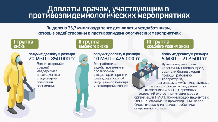 К третьей группе (среднего уровня риска) отнесены врачи и медперсонал карантинных стационаров, водители бригад скорой помощи, работники лабораторий, санэпидемслужбы, участвующие в лабораторных исследованиях по выявлению COVID-19, приемных отделений экстренных стационаров и организаций ПМСП, принимающих пациентов с ОРВИ, пневмонией и производящих забор биологического материала, работники оперативного штаба. Им предусмотрена доплата в размере 5 МЗП (212,5 тысячи тенге).