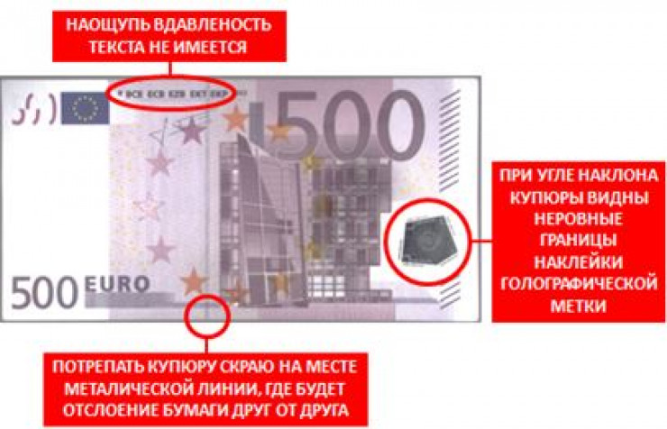 Чтобы не стать жертвой фальшивомонетчиков, специалисты рекомендуют запомнить простые признаки поддельных купюр номиналом 500 евро: