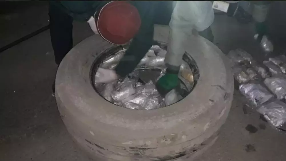 "На автомобильном пункте пропуска "Сырым" в Западно-Казахстанской области с использованием служебной собаки по кличке Леди в автомашине Renault Magnum под управлением гражданина Кыргызстана выявлены спрятанные в задних колесах автомобиля пакеты с веществом бело-серого цвета со специфическим запахом общим весом 135 килограммов 493 грамма 52 миллиграмма", - сообщили в комитете.