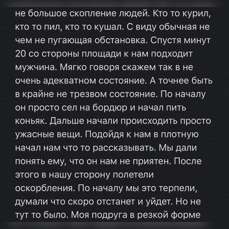 Там к подругам подошел неизвестный в нетрезвом виде. Мужчина начал что-то рассказывать девушкам, но они дали понять, что он им неприятен. В ответ полетели оскорбления. Когда одна из девушек резко попросила отстать от них, мужчина схватил ее за волосы и начал бить головой о капот.