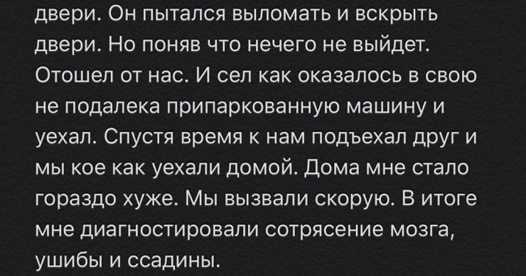 Мужчина попытался открыть двери, но, не сумев, сел в свою машину и уехал. У пострадавшей позже диагностировали сотрясение мозга, ушибы и ссадины.