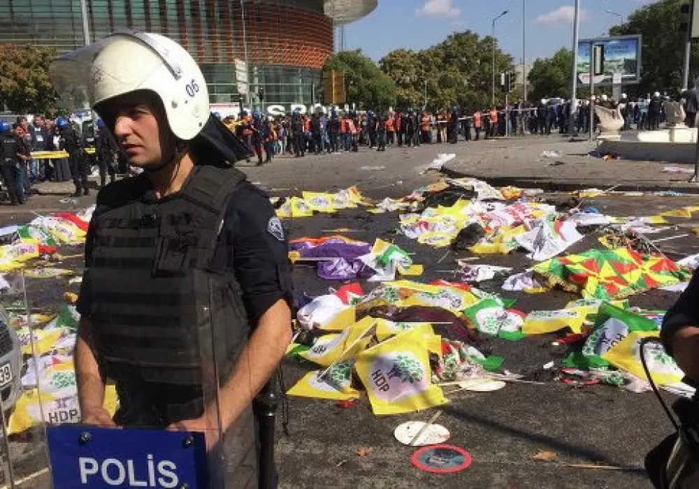 Офис премьера в письменном заявлении сообщил, что расследование теракта продолжается, прокуратура Анкары работает над установлением личностей погибших и проведением вскрытия. Напомним, два взрыва произошли в столице Турции перед началом митинга, который был организован профсоюзными и общественными организациями под лозунгами "Труд, мир, демократия" в знак протеста против всплеска насилия из-за турецко-курдского конфликта на юго-востоке страны. Как сообщают местные СМИ со ссылкой на источники в правоохранительных органах, взрывы были устроены террористами-смертниками в районе железнодорожного вокзала под эстакадой, где участники митинга проходили к месту его проведения.