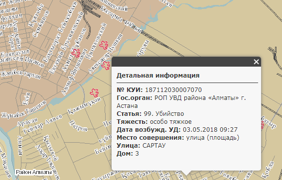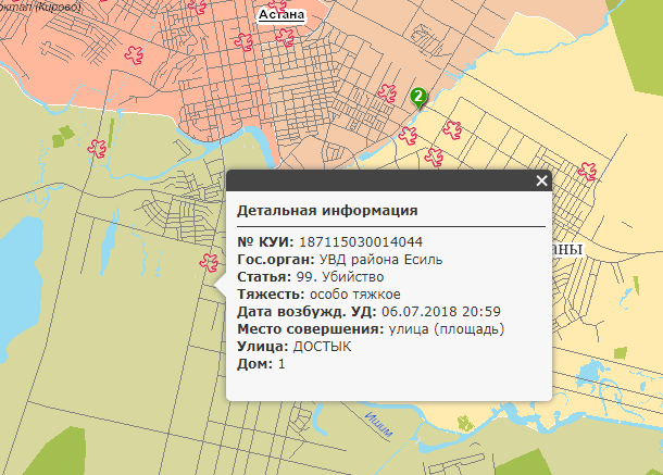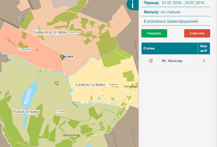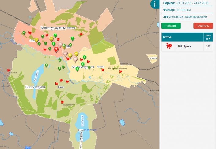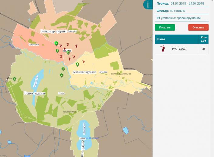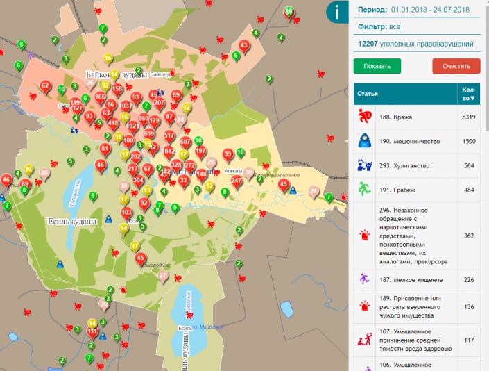 В столице Казахстана с начала года было совершено более 12 тысяч уголовных правонарушений. Согласно данным Карты преступности в Астане с 1 января было совершено 24 убийства. Один трагичный случай произошел в день рождения столицы, 6 июля, в центре левого берега.