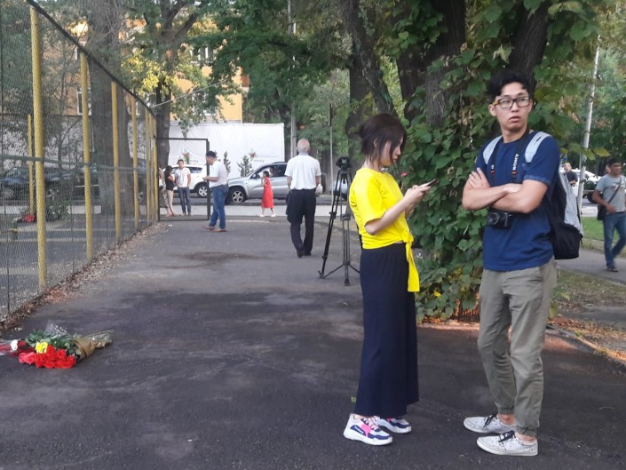Горожане собрались на месте, где напали с ножом на фигуриста Дениса Тена, на пересечении улиц Курмангазы и Байсеитовой. Они возложили цветы и свечи.