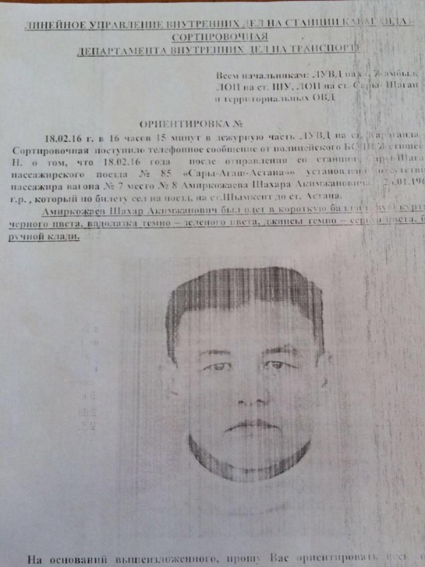 Как рассказала родственница, 52-летний уроженец Жамбылской области Шахар Амиркожаев 17 февраля сел в поезд до Астаны. А 18 февраля мужчина вышел на станции Сарышаган около 9 утра, чтобы покурить, и не вернулся в свой вагон.