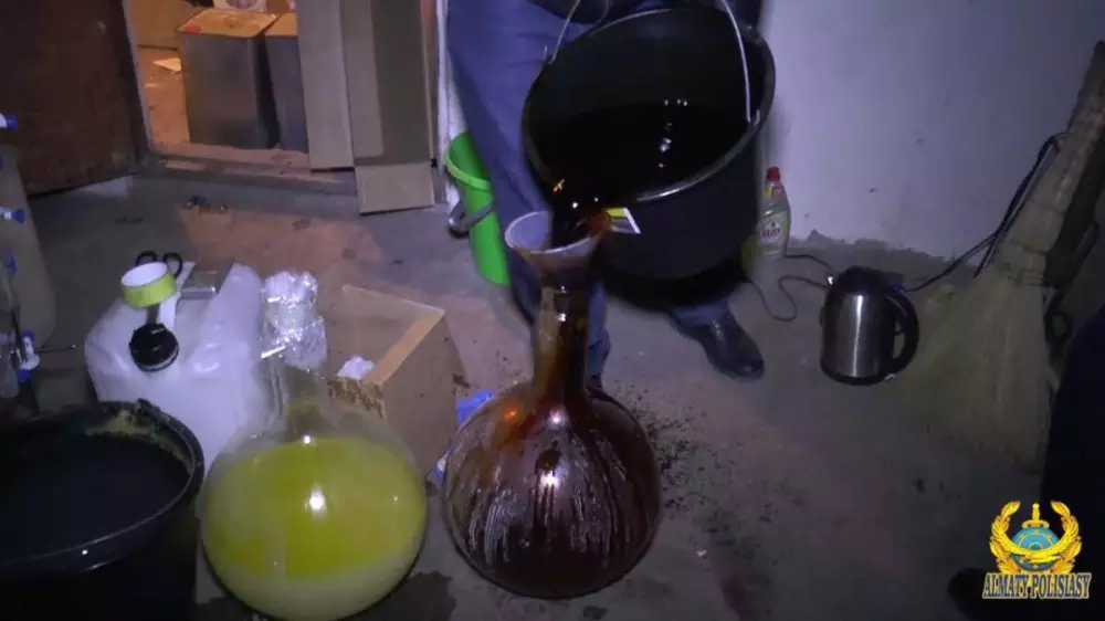"В ходе санкционированного обыска у них изъяты вещества в виде порошка и комочков, пластмассовые емкости с химическими веществами, лабораторные стеклянные колбы с жидкостями, электронные весы и другая атрибутика, использованная злоумышленниками при производстве синтетического психотропного вещества мефедрон. Установлено, что компоненты для наркотика подозреваемые получали из России, пользуясь услугами транспортно-логистической компании", – сообщил начальник Управления по противодействию наркопреступности ДП Алматы Ерлан Алмагамбетов.