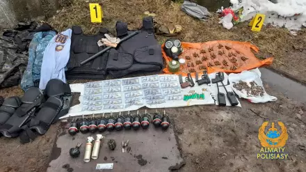 "Пакеты с пистолетами, патронами, полицейской формой были спрятаны в наземной канализации. В тайнике обнаружены три пистолета, одна боевая и 15 светошумовых гранат, свыше 100 патронов от пистолета системы "Макаров", 107 - от автомата Калашникова, 16 - от охотничьих ружей, два бронежилета, противогаз, радиостанция, полицейская форма, камуфлированный рюкзак, а также денежные средства в сумме 2 400 долларов. Не исключено, что оружие было похищено в ходе массовых беспорядков. По данному факту в Управлении полиции Медеуского района начато досудебное расследование по ст. 287, ч. 2 УК РК", – рассказал заместитель начальника по оперативной работе СИ-18 ДУИС по городу Алматы Азамат Аманжолов.