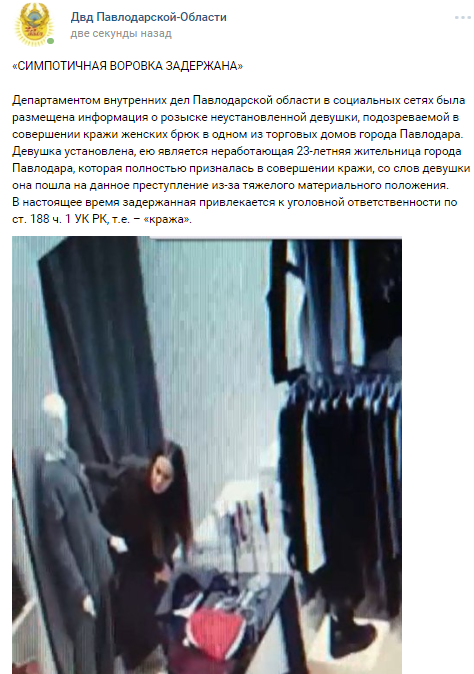 Ранее ДВД Павлодарской области разместил в соцсетях видео инцидента. На кадрах видно, как подозреваемая в краже показывается из примерочной и осматривается по сторонам. Когда консультант перемещается в другую часть бутика, девушка совершает суетливые движения рядом с примерочной. После этого она еще какое-то время будто выбирает вещи. Затем девушка берет с вешалки брюки и скрывается в примерочной.