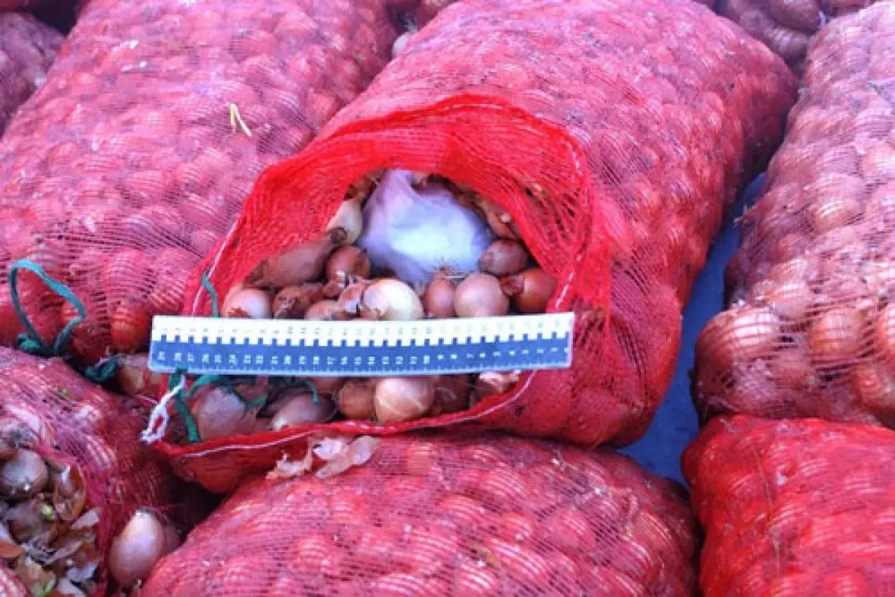 "В ходе досмотра автотранспорта в отдельных мешках с луком обнаружено и изъято 103 полимерных пакета, обмотанных скотчем, а также 504 луковицы, в которых находилось в общей сложности 164,5 килограмма героина и 44 килограмма гашиша. В одной луковице вмещалось до 200 граммов героина", - сообщили в КНБ.