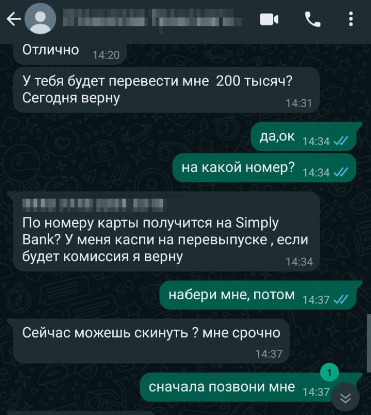 "Людям из моих контактов с моего WhatsApp стали рассылать сообщения с просьбой перевести им на счет в Simply 200 тысяч тенге. Якобы моя карта Kaspi находится на перевыпуске. Сообщения оправили моим друзьям и родственникам. Я сразу удалил свой аккаунт с телефона, перед этим опубликовав статус, что меня взломали и от моего имени сообщения рассылают мошенники. После этого рассылка прекратилась", - рассказал Станислав.