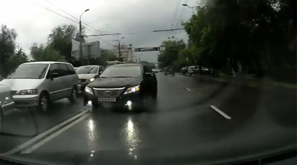 Выезд на встречку в Алматы совершили мужчина в форме прокурора и "комитетчик" Кадр видеорегистратора. ©youtube.com