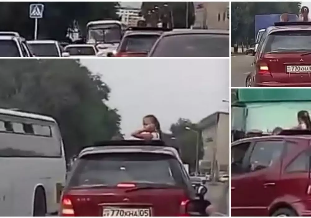 В городе Каскелен Алматинской области на видео засняли детей, которые едут в машине, высунувшись из люка, передает корреспондент Tengrinews.kz. Все происходит на оживленном перекрестке. Из люка Mercedes А-класса, зарегистрированного в Алматинской области, высовываются девочка в возрасте примерно десяти лет и мальчик - в возрасте около шести.