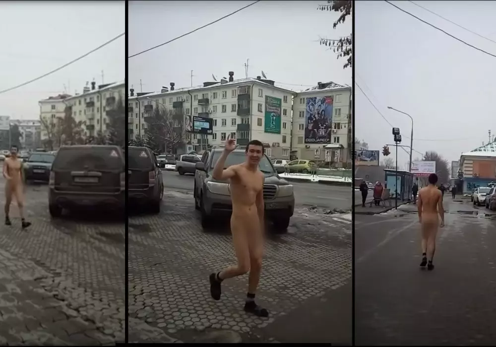 Жизнерадостный парень разгуливал голым по улице Усть-Каменогорска Кадры из видеоролика YouTube