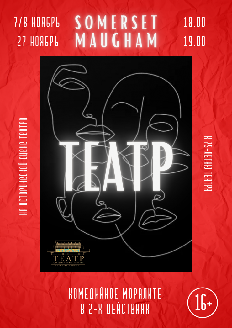 7 и 8 ноября состоится премьера спектакля "Театр", приуроченного к 75-летию образования театра. Салонная комедия по мотивам произведения Сомерсета Моэма. Спектакль расскажет о том, как порой люди сами создают себе мир, где зависят от надуманных муз и призрачных идеалов. Ироничная и тонкая история, основной линией которой является совокупность личных переживаний главной героини пьесы – известной актрисы Джулии Лэмберт.
