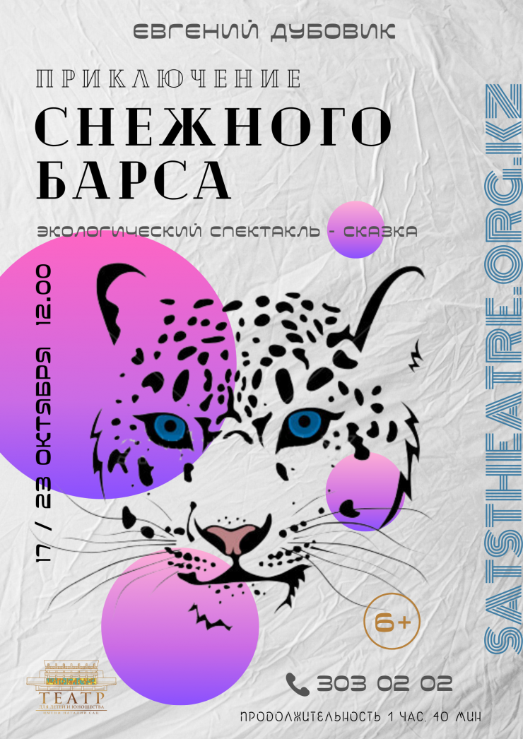 23 октября состоится премьера первого в истории театра экологического спектакля, приуроченного к Международному дню снежного барса - "Приключение снежного барса". Автор спектакля – заслуженный деятель Казахстана Евгений Дубовик. Главной темой постановки является воспитание экологического патриотизма у подрастающего поколения зрителей. Идея спектакля заключается в том, чтобы сохранить окружающую среду, в частности – исчезающую популяцию одного из видов животных Казахстана, занесенного в Красную книгу, – снежного барса. Безусловно, спектакль будет интересен и познавателен, ведь он несет в себе невероятную силу для духовного развития личности.