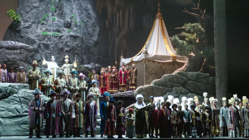 Уже первая картина ярмарки захватывает воображение зрителя: здесь талантливые народные умельцы, мастера-ремесленники, бойкие торговцы, беркутчи на коне и ловкие канатоходцы! Благодаря использованию 3D-технологий картины природы и быта оживают. Красочные костюмы заслуженных деятелей Казахстана Софьи Тасмагамбетовой и Павла Драгунова, видеопроекции итальянского мастера Серджио Металли, но главное – великолепная музыка, прекрасные голоса солистов и слаженное звучание оркестра и хора из года в год дарят публике незабываемые впечатления.