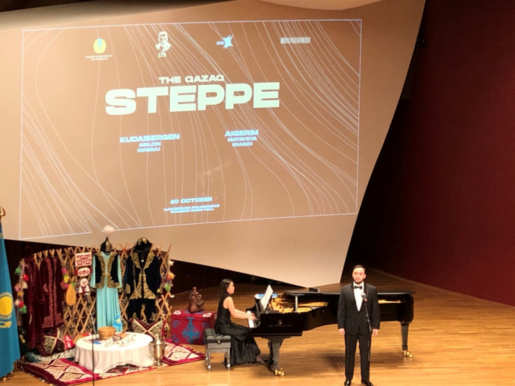 Молодые казахстанские музыканты – пианистка Айгерим Матаева и солист оперы Кудайберген Абильдин – исполнили такие известные произведения из творчества Абая, как "Желсіз түнде жарық ай", "Құлақтан кіріп, бойды алар", "Көзімнің қарасы", "Айттым сәлем, қаламқас", романсы Николая Римского-Корсакова и другие произведения.