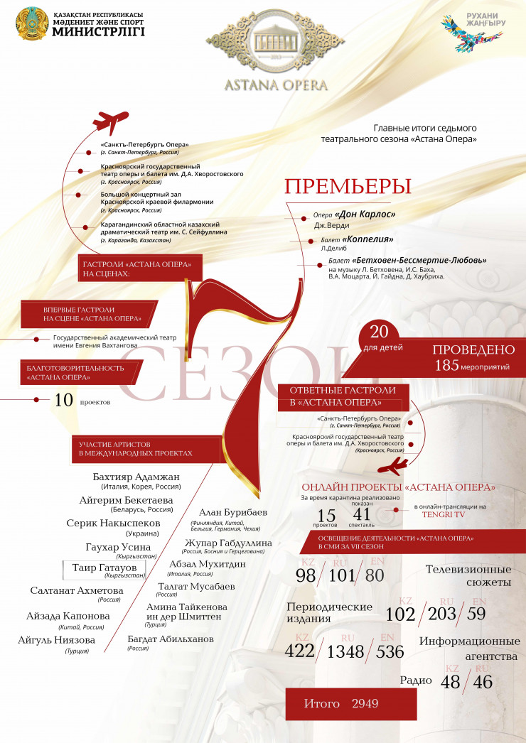 Для поклонников "Астана Опера" творческий коллектив провел 185 мероприятий, из них 20 для детской аудитории. За период карантина реализовал 15 онлайн-проектов, показал 41 спектакль в трансляции на TENGRI TV. Деятельность театра активно освещалась в СМИ и за VII сезон, согласно статистике, было опубликовано порядка 3 тысяч материалов в прессе.