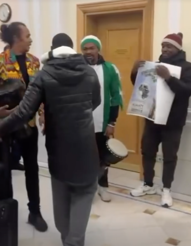 Публикация о том, что Akon прибыл в Алматы, появилась сегодня днем. Звезду и его команду встретила группа музыкантов, которые отбивали музыку на джембе (африканские барабаны – прим. ред).