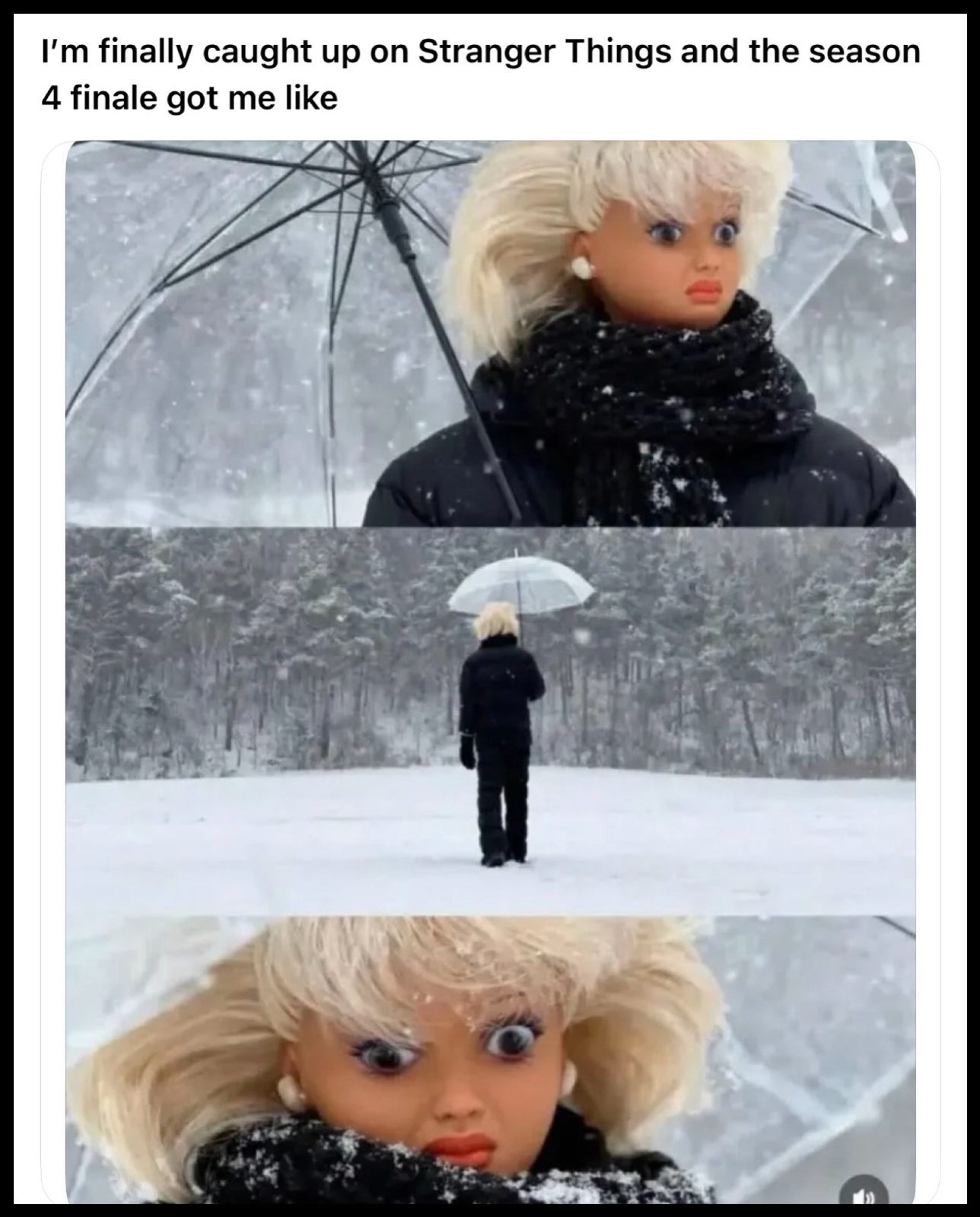 Мем с куклой, стоящей в заснеженном лесу с "застывшим" взглядом, стал символом шока, отвращения и осознания неприятной правды.