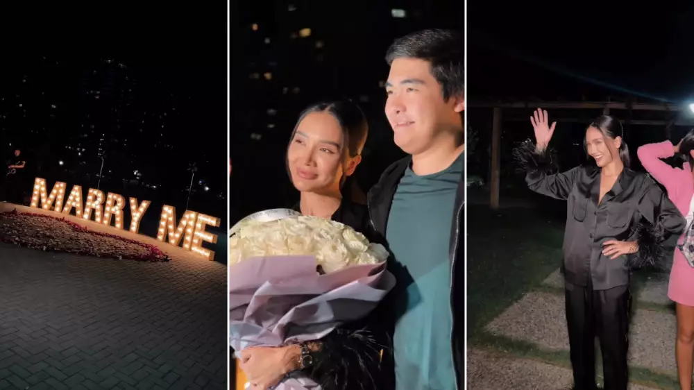 На предложении-сюрпризе присутствовали самые близкие люди Айжан: мама, брат Алихан, сын Алан. Девушку с завязанными глазами подвели к заветной фразе Marry me, и, стоя посреди огромного сердца из лепестков роз вместе со своим женихом, она сказала "да".