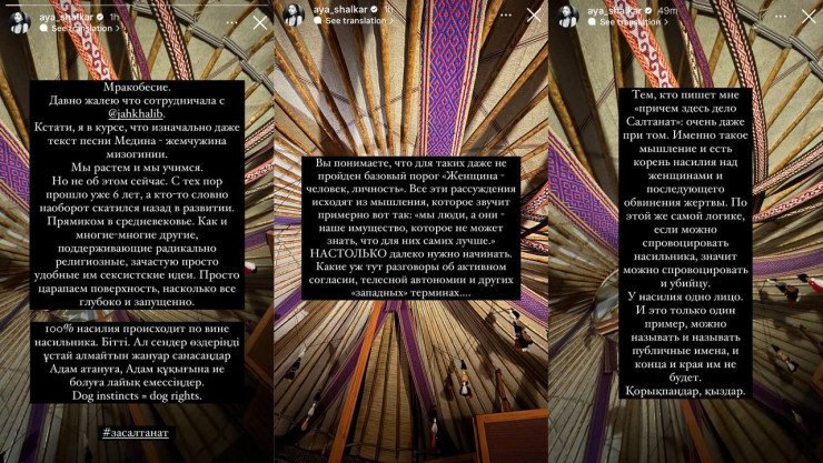 Популярная модель, предприниматель и художница опубликовала stories на своей странице в Instagram, где заявила о том, что жалеет, что когда-то работала с певцом. Она также отметила, что текст песни "Медина", где снялась Айя, изначально является "жемчужиной мизогинии". Айя подчеркнула, что мы все растем и учимся, но некоторые, наоборот, скатываются назад в развитии, поддерживая радикально религиозные и сексистские идеи.
