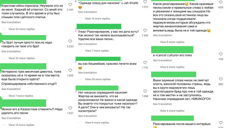 "Не то место - мой подъезд. Не та одежда, пальто и валенки. Не то время - вечер, после практики в ресторане, было ещё светло. Он погнался за мной, заскочив в подъезд. Я не была с ним знакома", "Разочарование в Джах Калибе", "Короткая юбка спросила "Неужели я и правда была виновата?" Хиджаб ей ответила: "Со мной это тоже случилось" В это время где то в углу всхлипнуло детское маленькое платьице", "Мерзость", "У Джах Калиба есть дочь... Как он может с таким видом говорить про одежду? Его дочь, не дай Бог, это тоже может затронуть. Что он скажет в таком случае", "Вроде взрослые мужчины сидят", - возмутились комментаторы под роликом.