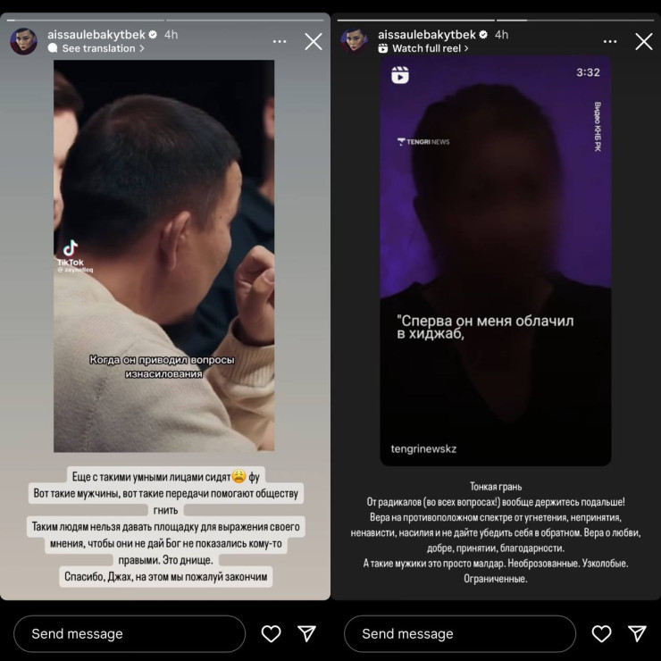 К блогерам присоединилась и инфлюенсер Айсауле Бакытбек-Кайдарова, дочь Баян Алагузовой. Девушка заметила, что "такие мужчины помогают обществу гнить". Она порекомендовала держаться подальше от радикалов и также обратила внимание, что "вера на противоположной спектре от угнетения, неприятия, ненависти и насилия".