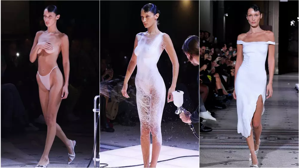 Модель появилась на подиуме топлес и белых босоножках. А команда во главе с испанским дизайнером Манелем Торресом создала минималистичное белое платье в бельевом стиле прямо на теле Хадид, которое идеально подчеркнуло ее фигуру. Вышло очень эффектно.