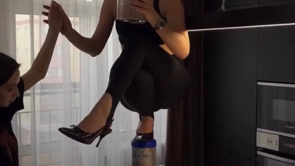 Как сообщает Telegram-канал SHOT, девушка решила повторить опасный челлендж, став на шпильке одной ногой на кастрюлю, сверху которой стояла банка детской смеси. Конструкция оказалась нестабильной, и Мариана сорвалась со столешницы.