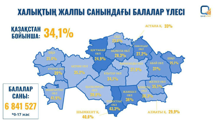 Среди регионов наибольшая доля детей наблюдается в Туркестанской области, где 43,3 процента населения составляют дети до 18 лет. За ней следуют Мангистауская область с 41,9 процента и Шымкент с 40,6 процента.
