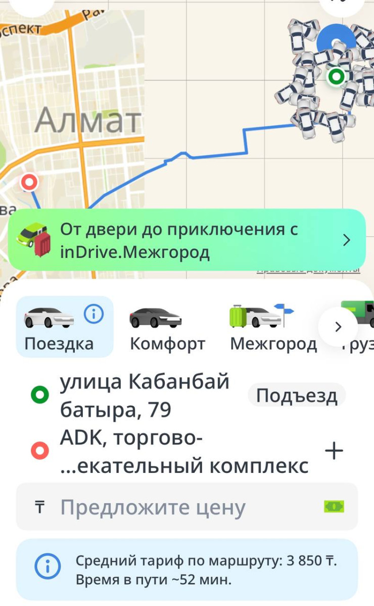 Сейчас столько стоит такси на InDriver, от Кабанбай батыра до Сатпаева. Тариф "Эконом" - в районе 3850 тенге. Видно, что на линии скопилось множество таксистов.