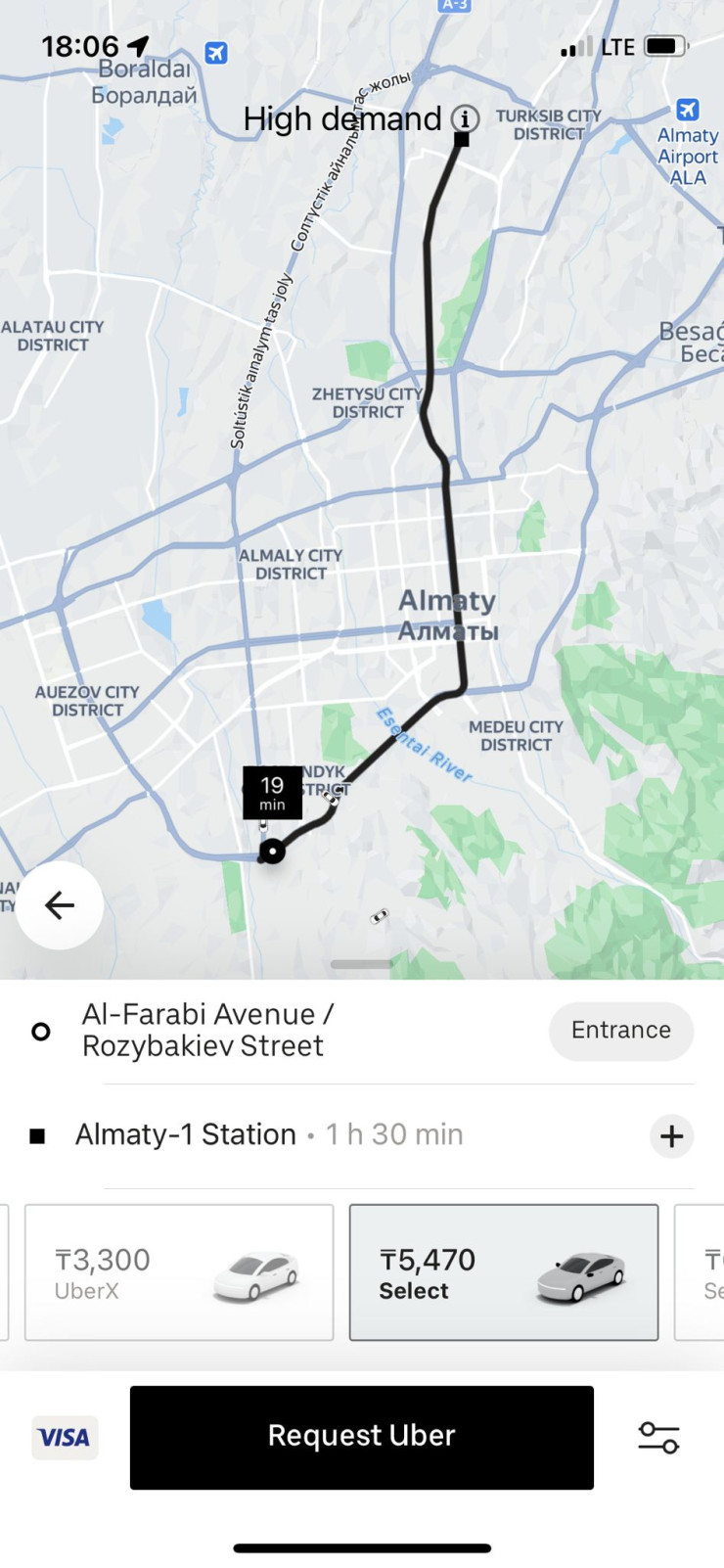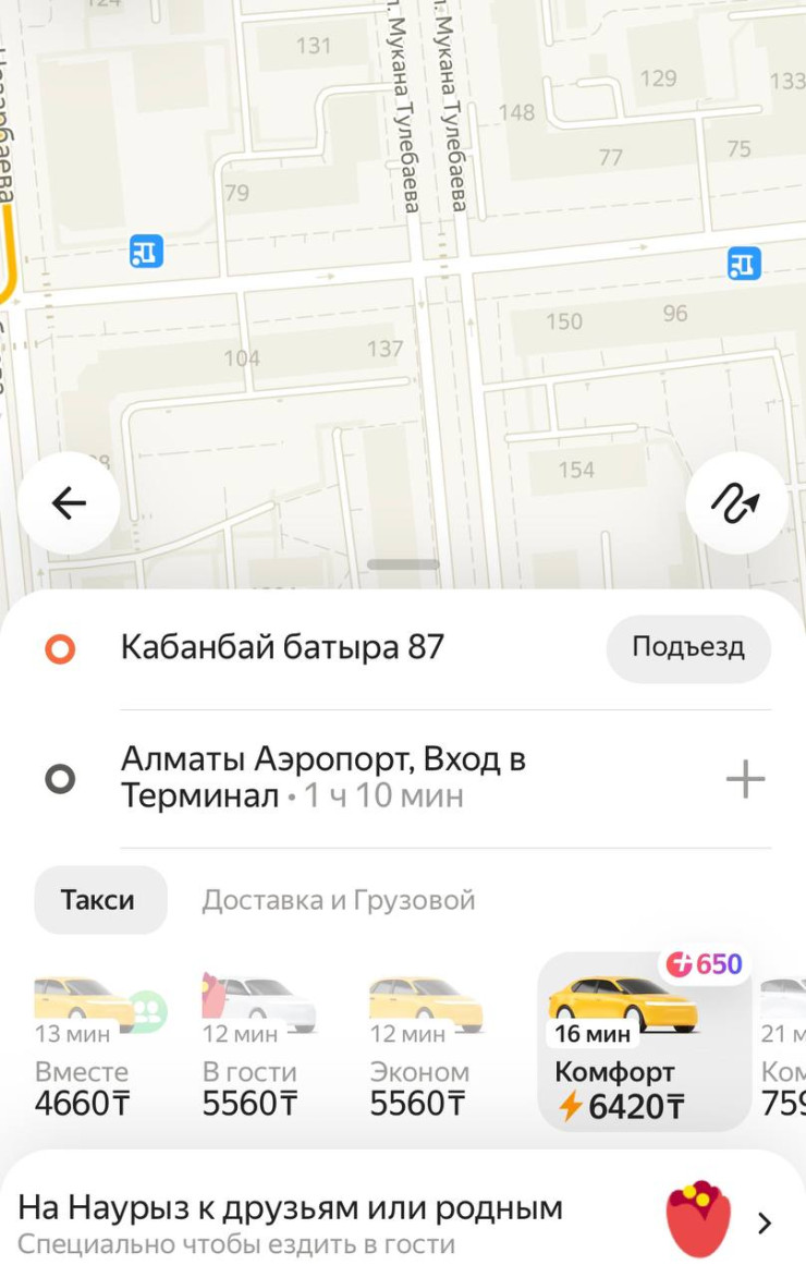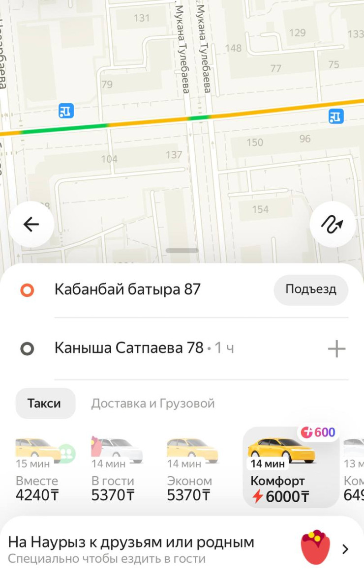 Видно, что спрос на такси повышенный, а время ожидания на тарифе "Комфорт" – 14 минут. Поездка составит примерно час, заплатить нужно будет около шести тысяч тенге.