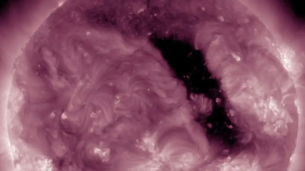 Вместе с тем в ближайшие два дня основным фактором космической погоды станет именно поток плазмы из корональной дыры. Земля начала входить в поток плазмы, исходящий из крупной корональной дыры на Солнце.