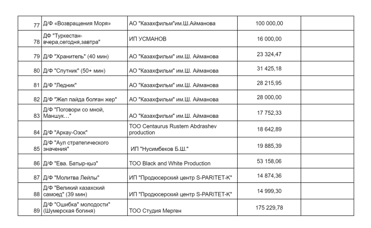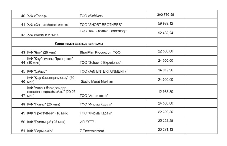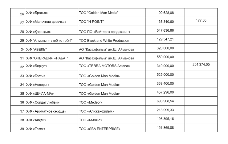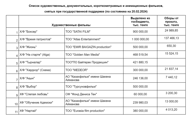 ТОО "Турсуновфильм", руководителем которого является режиссер, писатель Ермек Турсунов с 2019-го по 2021 год получило государственную поддержку в размере 500 миллионов тенге на производство полнометражного художественного фильма "Бесмойнак". Картина в прокат не вышла.