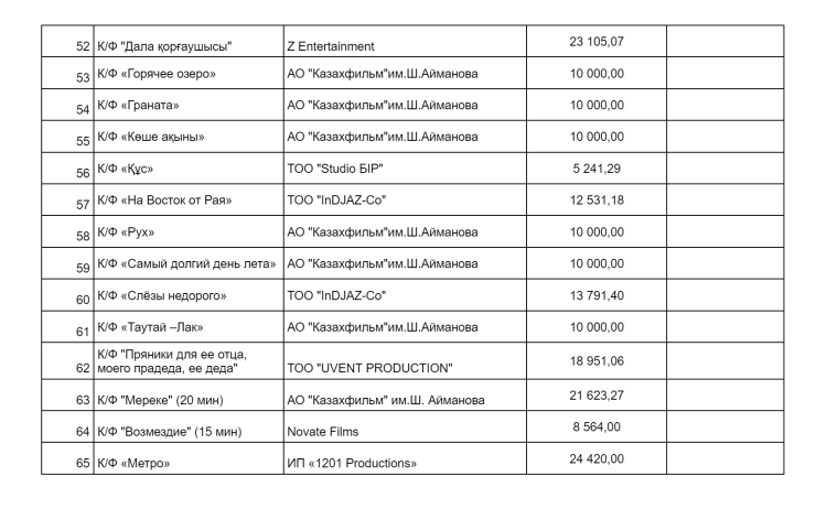 "За 5 лет существования центра профинансировано 103 проекта, из которых завершено производство 98 фильмов различных жанров на сумму 19 миллиардов тенге. В том числе 42 художественных, 23 документальных, 25 короткометражных фильмов, 8 анимационных. В кинотеатры, телевизионный и онлайн-прокат выпущено лишь 23 картины (художественные фильмы – 20, документальные фильмы – 3). 27 фильмов, снятые до 2023 года включительно, выйдут в прокат в 2024 году", - сообщили в министерстве.