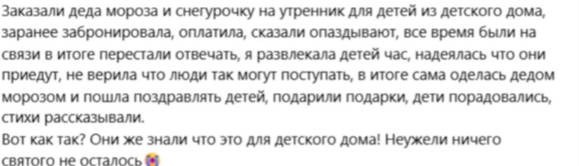 В итоге девушке пришлось самой спасать праздник - она переоделась в костюм Деда Мороза и взяла на себя роль аниматора. В своей публикации автор рассказала, что заранее заказала и оплатила услуги аниматоров для новогоднего утренника в детском доме.