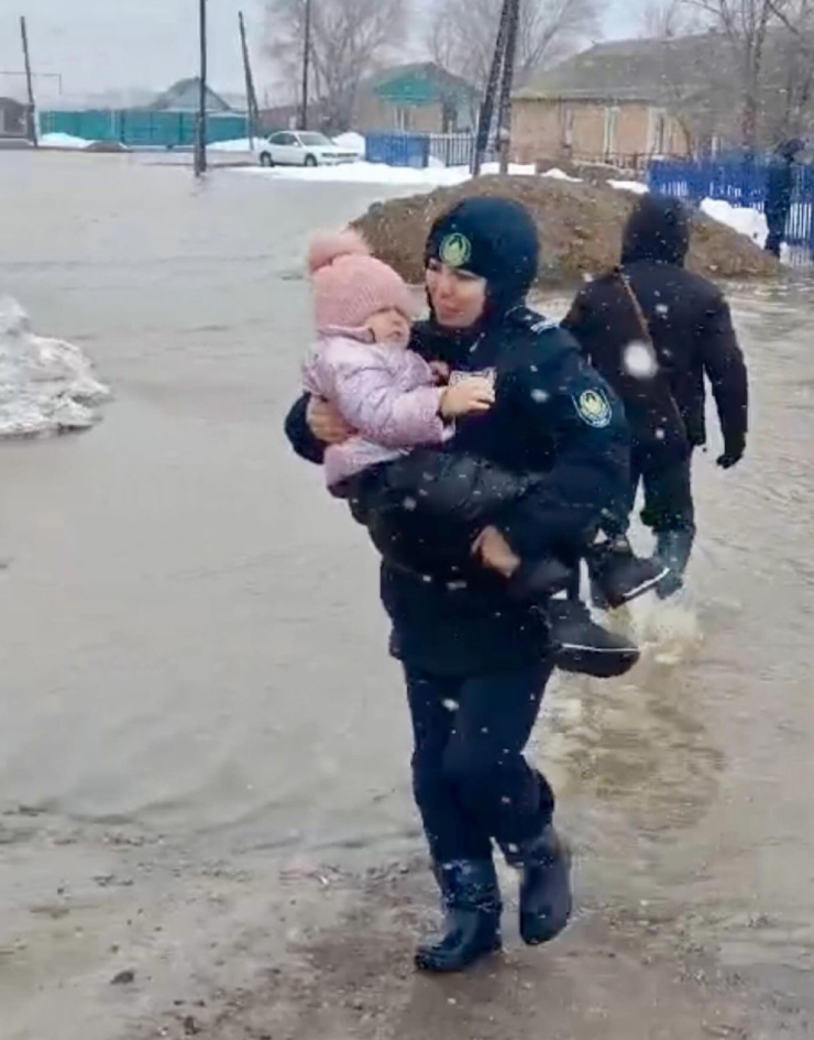 В сложный момент не остались в стороне и женщины. Прекрасных казахстанок не пугают тяжелый физический труд, песок, ветер или снег. Без страха женщины-полицейские эвакуируют маленьких казахстанцев.