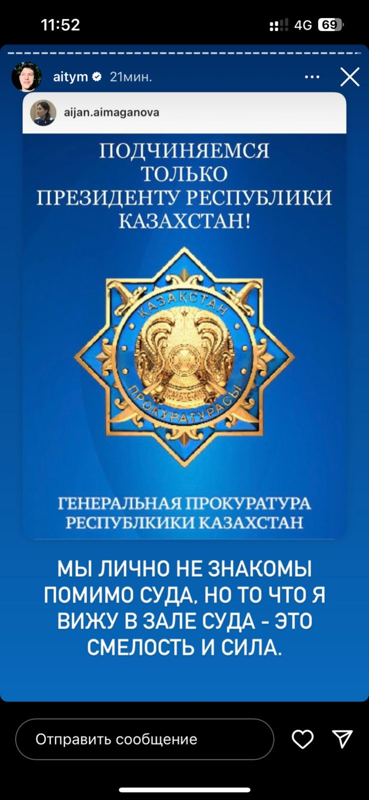 Публикации из данного аккаунта быстро разлетелись в социальных сетях. Брат погибшей Салтанат Нукеновой Айтбек Амангельды также поделился в своих stories постом из профиля и прокомментировал, что видит в зале суда "смелость и силу".