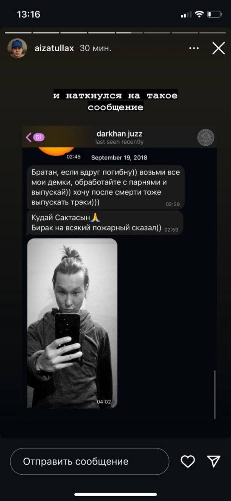 "Братан, если вдруг погибну, возьми все мои демки, обработайте с парнями, и выпускай. Хочу после смерти тоже выпускать треки. Құдай сақтасын. Бірақ, ("Упаси бог, но..." - перевод с казахского) на всякий пожарный сказал", – попросил Дархан в переписке.