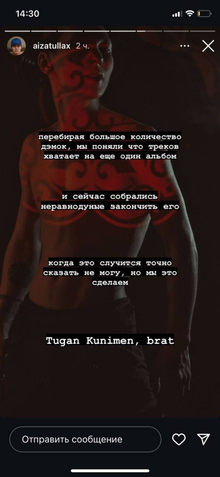 "Перебирая большое количество демок, мы поняли, что треков хватает на еще один альбом, и сейчас собрались неравнодушные, закончить его. Когда это случится, точно сказать не могу, но мы это сделаем", – написал Айзатулла в своих stories.