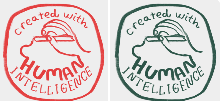 С начала лета представители художественной индустрии создают свои логотипы, где пишут фразу: Created with human intelligence. Так, одна из пользовательниц написала, что ее логотип можно использовать без ограничений, при условии, что художники создают арты без помощи ИИ. Там же мнение выразили и другие художники, которые буквально объявили войну искусственному интеллекту. Опубликован был данный протест на портале Substack, напоминающий платформу для различных обсуждений. С предложением девушки оказались солидарны тысячи дизайнеров и художников.
