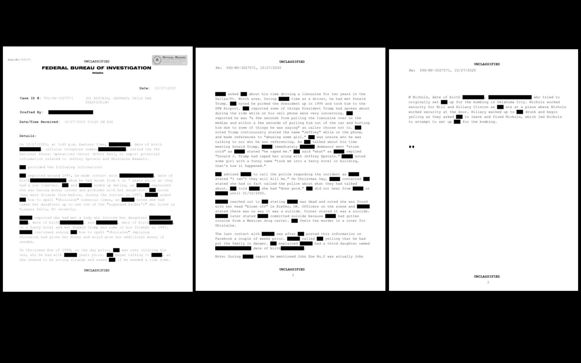 Речь идет о деле ФБР, датированном 27 октября 2020 года. Это так называемый intake-отчет — запись обращения в Национальный центр операций по угрозам ФБР (NTOC), куда позвонил человек, представившийся свидетелем информации, связанной с Джеффри Эпштейном и Гислейн Максвелл. В документе не указаны имена заявителя и других фигур, большинство персональных данных отредактированы.