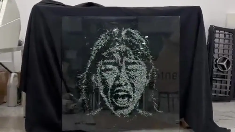 Пользователи соцсетей заметили новую работу Нуртазина. Автор словно несколькими ударами по стеклу создает впечатляющие картины.