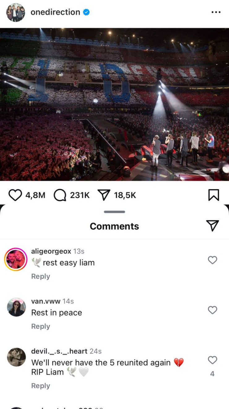 Поклонники One Direction и музыканты скорбят после неожиданной новости о смерти Лиама Пейна. Сотни тысяч фанатов по всему миру выражают свои соболезнования, а под последним постом в официальном аккаунте группы One Direction в социальных сетях каждую секунду появляются новые комментарии. Фанаты не в силах поверить в произошедшее и делятся своими эмоциями, выражают боль и шок от утраты любимого исполнителя.