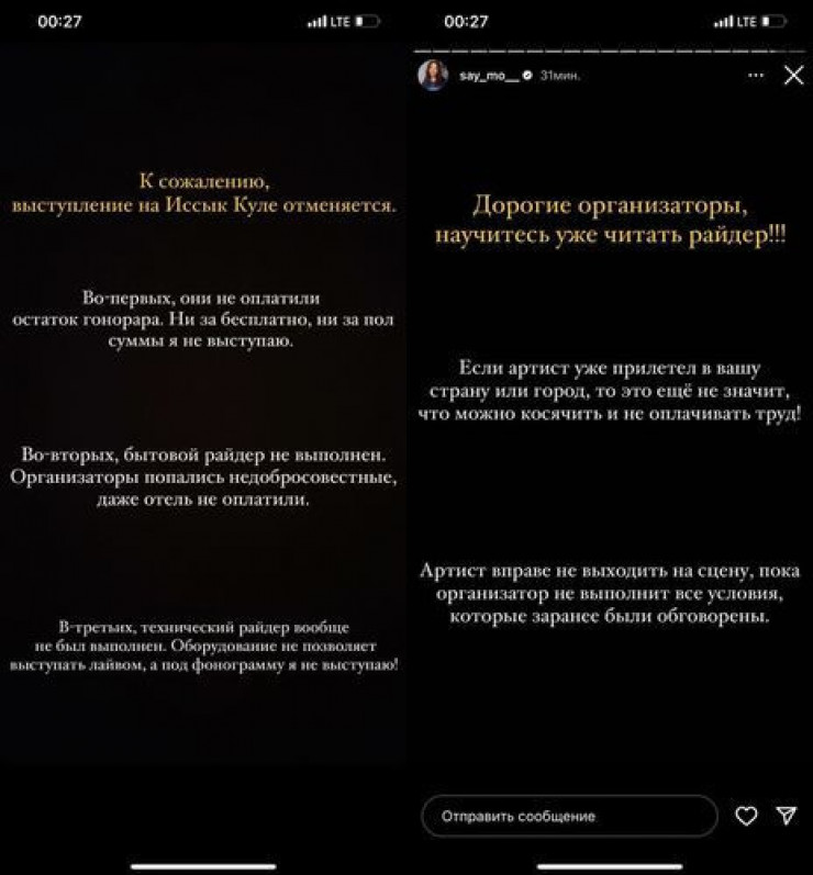 Сама певица в соцсетях объяснила, что ей не выплатили полную сумму гонорара. Поэтому она не вышла не сцену. "Выступление на Иссык-Куле отменяется. Во-первых, они не выплатили остаток гонорара. Ни за бесплатно, ни за полсуммы я не выступаю. Во-вторых, бытовой райдер не выполнен. Организаторы попались недобросовестные, даже отель не оплатили", - написала рэп-исполнительница.