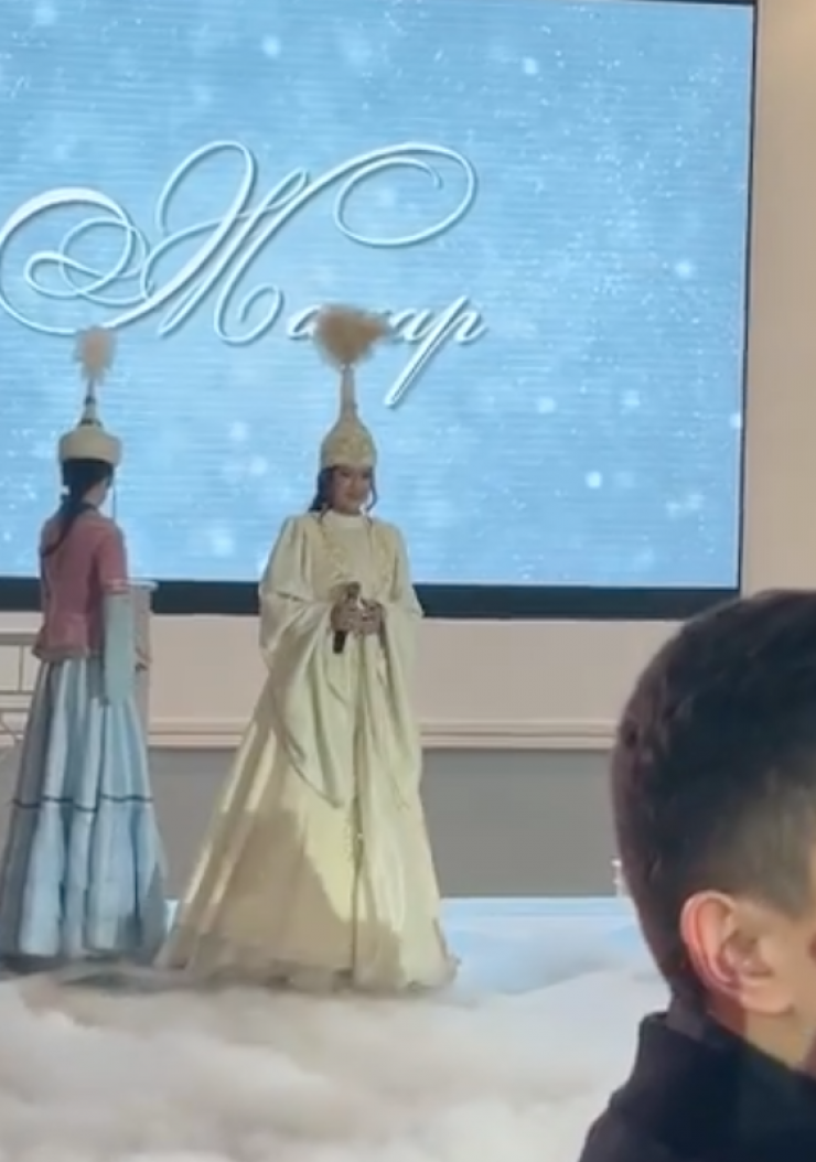 Мадина Садвакасова в качестве наряда выбрала платье белого цвета, золотистый камзол и саукеле. Пользователи наряд раскритиковали, отметив, что невеста – Жанар, а посему образ был не к месту.