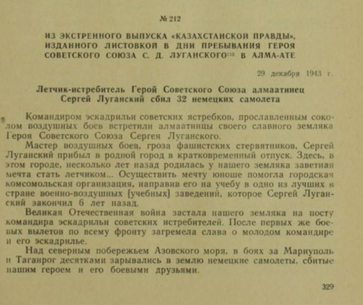 Имя дважды Героя Советского Союза и командира экскадрильи 270-го истребительного авиационного полка Сергея Луганского знает каждый алматинский ребенок и взрослый. К концу войны он совершил 390 боевых вылетов, лично сбил 37 вражеских самолетов и еще 6 в группе. Подробнее о жизни и подвиге Сергея Луганского рассказывает Tengri Life.