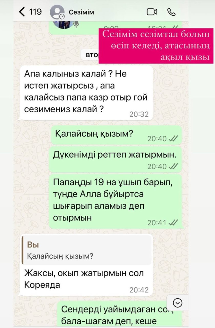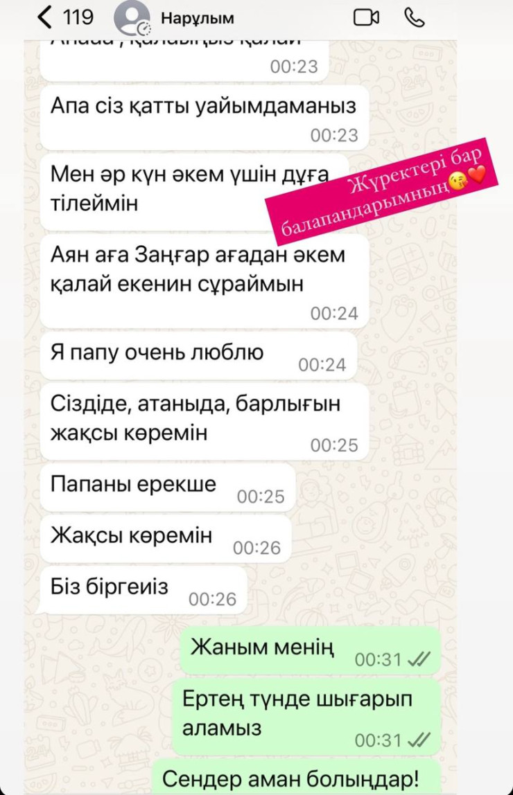 Также в сториз в Instagram Гульзира Айдарбекова опубликовала скрины семейных переписок. Судя по информации, написанной там, Кайрата Нуртаса выпустят в ночь с 19 на 20 июля.